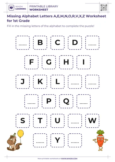 Alphabet completion worksheet → Early reading foundation → Children connect stable letter order to sounding out words and organizing print, strengthening future decoding, spelling, and dictionary skills.