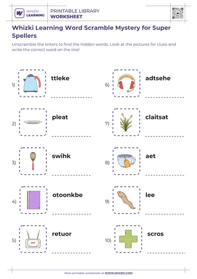 Easy-to-use printable worksheet for home or classroom. The Whizki Learning printable worksheet downloads instantly as a ready-to-use page for quick literacy centers, homework, or tutoring sessions. Parents and teachers can laminate the word scramble worksheet for repeated dry-erase use, supporting sustainable practice across multiple days. The clear fonts, generous spacing, and appealing vocabulary choices keep 6-year-old children focused while building confidence with anagrams, spelling practice, and early reading fluency.