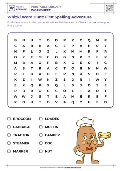 The Whizki Learning word search worksheet strengthens early reading fluency by guiding children to locate target words, reinforcing accurate spelling patterns and visual word memory.