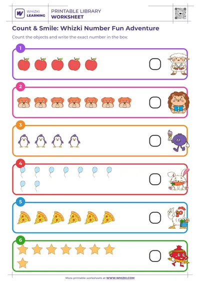 Whizki Learning brings joyful math to life with the Whizki Learning counting worksheet designed especially for 6 year olds in kindergarten. Young learners explore friendly penguins, bananas, toys, and shapes while building a solid foundation in early number sense. Certified early childhood educators at Whizki Learning carefully crafted the worksheet so every activity feels like a game while still following proven instructional strategies for beginning math.