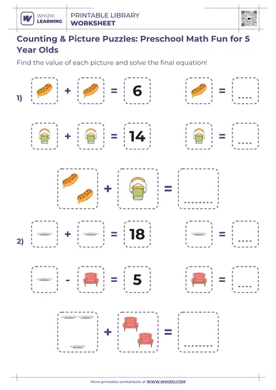 This Whizki Learning preschool math worksheet introduces three-year-olds to early counting and comparing skills through playful picture-based activities designed specifically for short toddler attention spans.