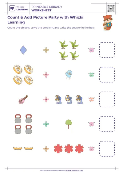 The visual math design of the Whizki Learning worksheet turns abstract numbers into clear, easy-to-understand pictures. Each group of illustrated objects helps the child connect quantities to numerals, so the child sees how counting objects leads naturally to adding two small groups together, reinforcing number sense through repeated, hands-on practice.