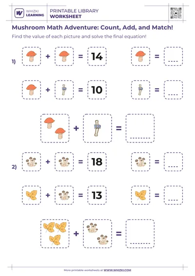 The Whizki Learning printable worksheet improves early addition within ten as children combine groups of themed objects and record sums, building accuracy and confidence.
