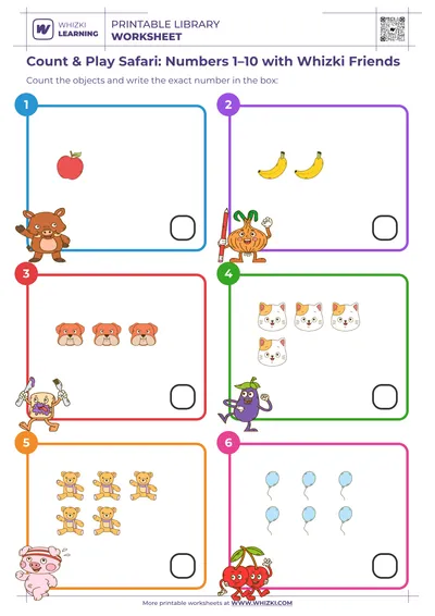 Whizki Learning Count & Play Safari gives 5-year-old children joyful practice with numbers 1–10, using bright, themed pictures to build strong early number sense. The Whizki Learning worksheet focuses on visual counting, helping young learners see how quantities connect to written numerals during engaging math play.