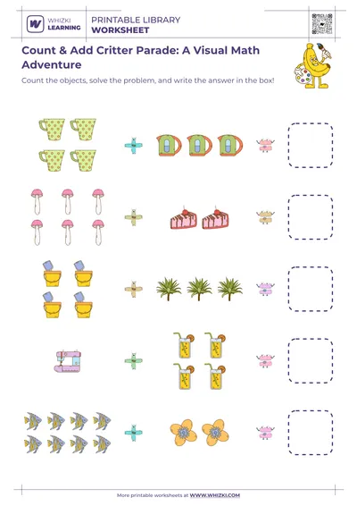 The Whizki Learning picture math worksheet strengthens comparison skills by asking children to count two groups and decide which group shows more, fewer, or equal objects. Visual comparison of small sets encourages logical thinking long before formal arithmetic begins. Children learn that numbers represent quantities that can be compared, creating a smooth bridge from counting objects to understanding addition and subtraction in later grades.