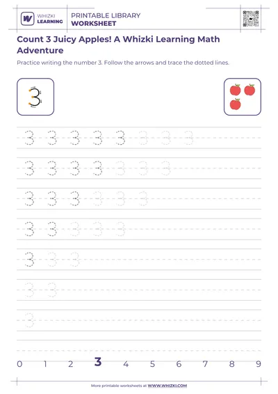 The Whizki Learning printable Number 2 worksheet fits easily into home learning, preschool centers, and kindergarten small groups, offering a quick, focused practice page that still feels like play. Families and teachers can pair the Whizki Learning worksheet with real apples, toys, or blocks, inviting the child to find, group, and trace the number 2 in multiple settings for deeper, longer-lasting math understanding.