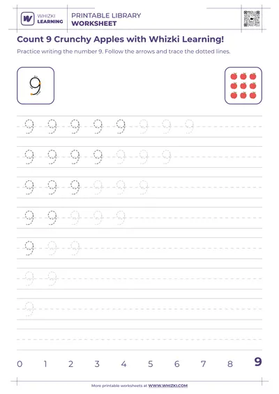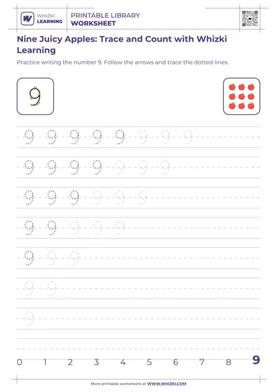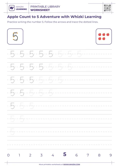 Whizki Learning 'Count to 7 Apple Adventure' introduces preschool children to counting and number recognition by focusing on the friendly number 7 through playful, apple-themed activities. The Whizki Learning worksheet is tailored for 5-year-old learners who are beginning formal math exploration and love bright, simple fruit visuals.