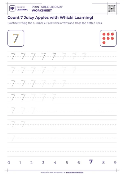 The Whizki Learning number 7 worksheet builds foundational math skills by combining number tracing with one-to-one correspondence, where each apple picture matches exactly one counted number word. The worksheet also strengthens fine-motor control, pencil grip, and visual focus, helping 5-year-old learners prepare for kindergarten writing, early arithmetic, and independent seatwork.