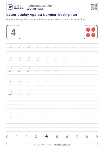 The Whizki Learning Count to Six Fun-Run with Apples worksheet gives 1st grade children a joyful way to master the number 6 by combining clear numeral tracing with bright apple illustrations. The Whizki Learning worksheet is carefully designed for ages 7 and up to strengthen number recognition, counting accuracy, and early handwriting skills in a single focused activity. Parents and teachers can rely on this Whizki Learning resource to provide structured, age-appropriate practice that feels like a game instead of a test.
