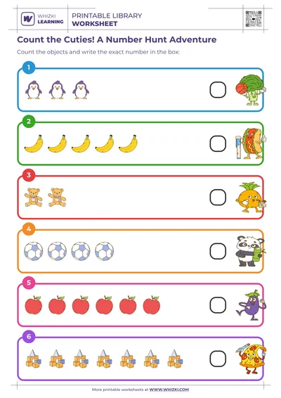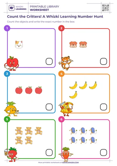 Build number sense and confidence. The Whizki Learning counting worksheet strengthens number recognition, one-to-one correspondence, and comparison language such as more, fewer, and equal. Children gain confidence as young learners count each picture, say each number aloud, and connect quantities to written numerals, forming a solid foundation for future addition and subtraction.