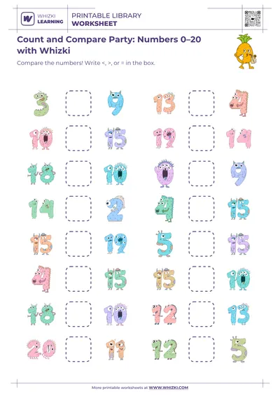 The Whizki Learning number comparison worksheet introduces quantitative language such as more, fewer, and same, helping the child describe groups from 0 to 5 confidently.
