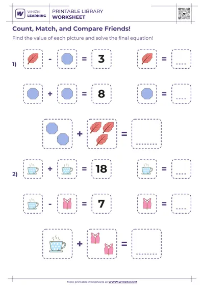 Whizki Learning early math resource aligns with common preschool and kindergarten readiness goals by targeting counting to 10, comparing sets, and first addition and subtraction. Professional curriculum designers and certified teachers at Whizki Learning structured the worksheet to move from easier tasks to slightly more challenging puzzles, supporting a gradual release of responsibility. Parents and educators gain a trusted, expert-created tool for nurturing strong math foundations during a critical window of cognitive development.