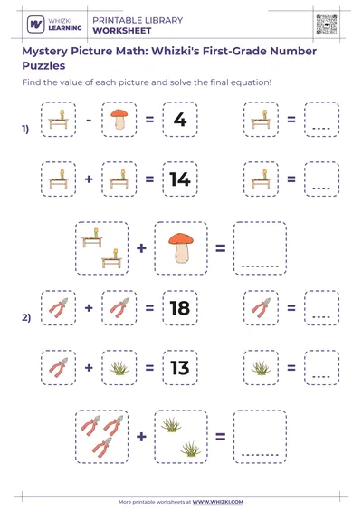 Each Whizki Learning math puzzle invites the child to count hot dogs, buckets, plates, and chairs, then match groups, complete simple number sentences, or solve which group shows more or fewer objects. Clear visual structure helps the child connect quantities with written numerals, supporting a smooth transition from concrete counting to abstract number symbols. The worksheet encourages the child to check answers by recounting pictures, which strengthens accuracy and attention to detail.