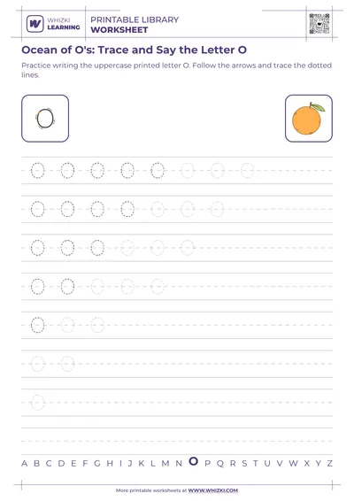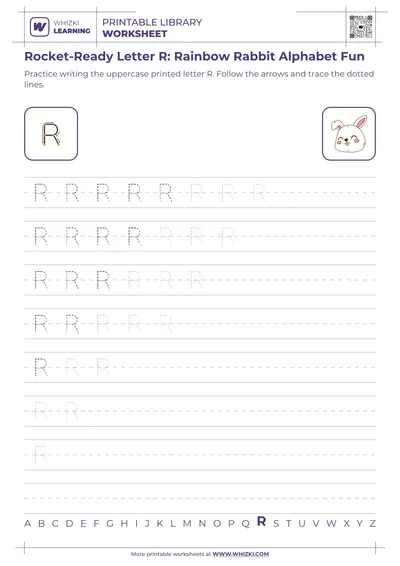 The Whizki Learning alphabet worksheet enhances letter recognition accuracy as children repeatedly trace and name uppercase D, linking visual shape with the spoken /d/ sound.