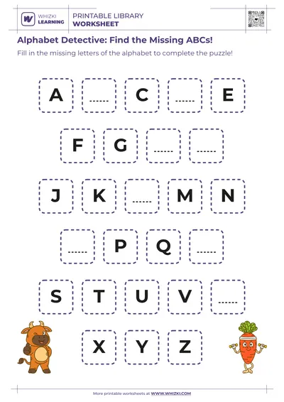 The Whizki Learning worksheet also supports early writing development by encouraging the child to trace or write the missing letters in the empty spaces. Families and educators can invite the child to use crayons or markers to form big, clear letters, which builds fine motor strength and hand-eye coordination. The guided alphabet structure on the Whizki Learning worksheet reduces frustration, allowing the child to focus on correct letter shapes and stroke direction, which prepares young learners for more formal handwriting practice.