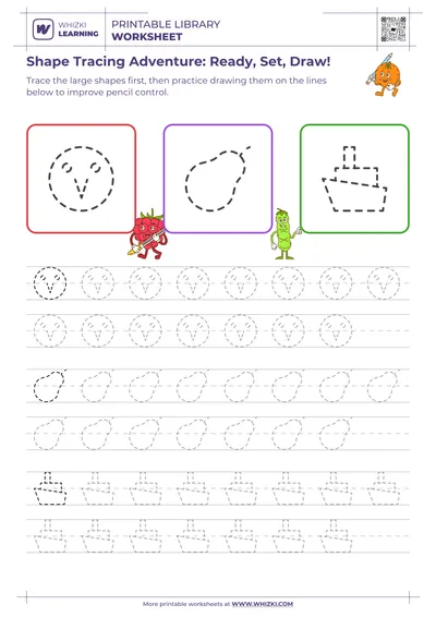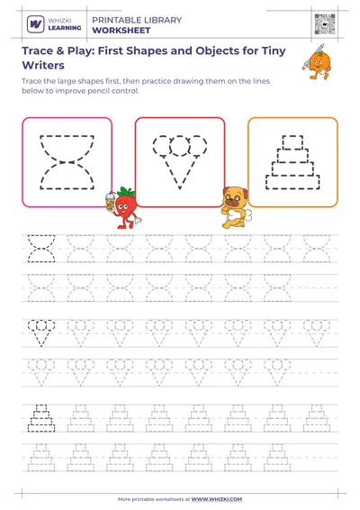 Whizki Learning printable worksheet for tracing shapes and objects offers flexible use at home, in preschool, or in kindergarten centers, giving families and teachers a ready-to-use pre-writing tool. Parents and educators can laminate the page for repeated dry-erase practice, turning one printable worksheet into an ongoing routine that steadily improves control, focus, and early literacy confidence.