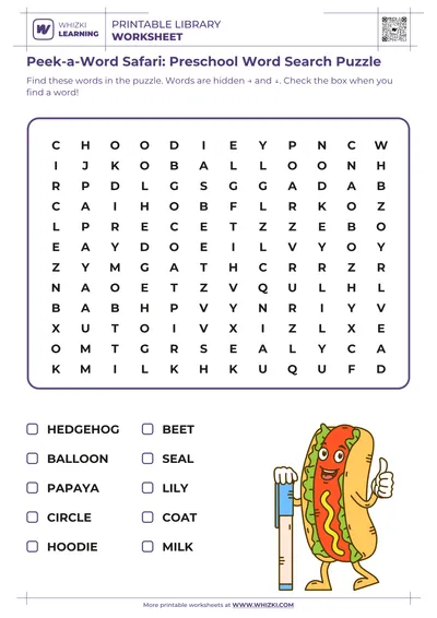 Each Whizki Learning printable word search worksheet features engaging vocabulary such as balloon, tractor, and hippo, encouraging children to scan carefully, sound out letters, and strengthen decoding skills while connecting fun everyday words to strong reading habits.