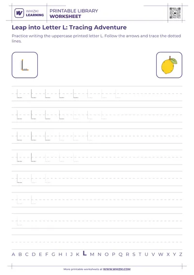 The Whizki Learning Letter I worksheet strengthens early handwriting skills by guiding the child through clear, simple strokes. Large printed letter I outlines support developing fine-motor muscles in small hands, while directional cues encourage proper top-to-bottom and straight-line formation. The Whizki Learning layout offers ample space so the child can practice control without frustration, building confidence with every successful trace of the big letter I.