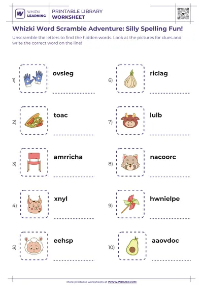 Playful word scramble fun for early readers. The Whizki Learning Jungle Jumbles word scramble worksheet gives young children a playful introduction to anagrams, early spelling practice, and rich vocabulary. Certified early childhood educators and literacy specialists designed the Whizki Learning worksheet to match the curiosity of age 3 children while still challenging 1st grade readers. The Whizki Learning printable worksheet uses familiar animals and everyday objects to make each scrambled word puzzle feel like a mini mystery to solve.
