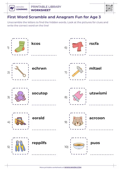 Whizki Learning Word Scramble Fun introduces 4-year-olds to playful anagrams, early spelling practice, and real-life vocabulary through a research-informed printable worksheet designed by experienced early childhood educators. The Whizki Learning word scramble worksheet uses big, friendly images and chunky letter shapes so young children feel confident while exploring first reading and writing experiences.