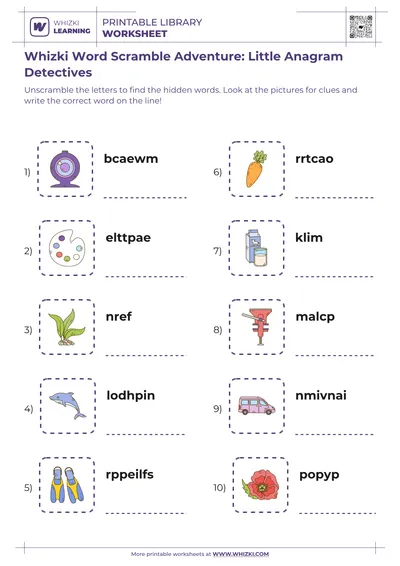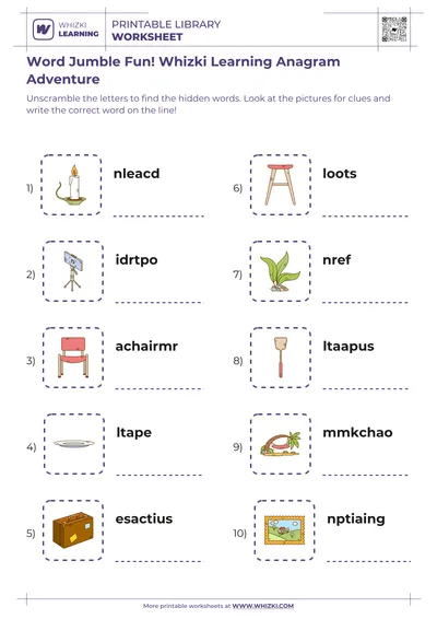 The Whizki Learning printable worksheet works beautifully for quiet-time activities, literacy centers, homeschool mornings, or tutoring sessions. Families and teachers can print multiple copies for repeated practice, invite children to trace letters with crayons or markers, and celebrate each solved word scramble, nurturing curiosity, focus, and a lifelong love of reading and writing.