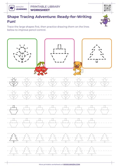 The Whizki Learning tracing worksheet improves pencil control accuracy by guiding children to trace 20–30 shapes, building confidence for early handwriting and letter formation.
