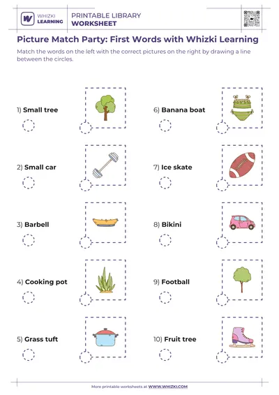 The Whizki Learning worksheet strengthens early literacy foundations by guiding children to match ten printed nouns with corresponding pictures, increasing vocabulary precision and visual word recognition speed.