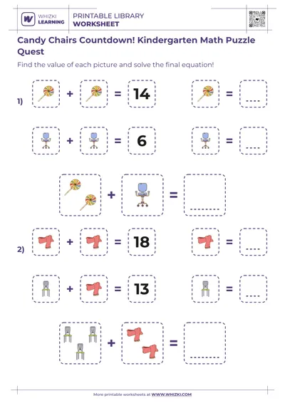 The Whizki Learning math puzzle worksheet strengthens number sense by guiding the child to match objects, numerals, and simple equations in a highly visual format. Each puzzle invites the child to reason about how many objects are shown, how quantities change, and which groups are greater or smaller. The clear structure supports children who benefit from concrete, picture-based math experiences before moving into abstract symbols alone.