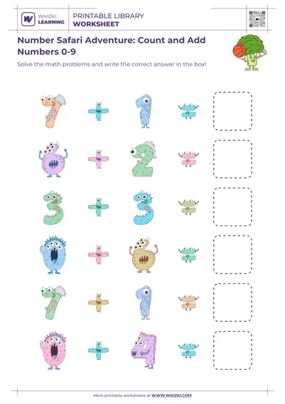 The printable Whizki Learning worksheet offers flexible use for home, classroom centers, tutoring sessions, and homework support. Families can print the Whizki Learning resource again and again for extra practice, while teachers can use the worksheet as a quick assessment of counting and addition skills within 0–9. Consistent work with the Whizki Learning Number Ninjas worksheet helps the child gain confidence, accuracy, and speed, creating a strong launchpad for later work with teen numbers and more advanced arithmetic.