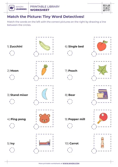 Make independent practice simple for home or classroom learning with Whizki Learning printables. The Whizki Learning word-picture matching worksheet requires only a pencil or crayon, supports quick printing, and offers clear visual cues so 5-year-old children can work with minimal adult help while still benefiting from structured, standards-aligned reading and writing preparation.