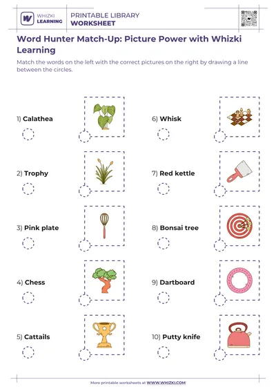 Whizki Learning Picture Match Word Hunt offers a playful, research-informed worksheet that helps children aged seven and above connect printed words to clear, friendly pictures for early literacy success.
