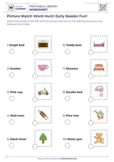 The Whizki Learning worksheet strengthens word recognition accuracy from pictures to print by guiding the child to match ten themed vocabulary words independently.
