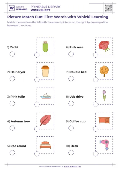 This Whizki Learning worksheet focuses on word-to-picture matching as a powerful bridge between recognizing written words and understanding real-world objects. By scanning each word, saying the word aloud, and then finding the matching picture, the child practices visual decoding, oral language, and comprehension in a single integrated task. Educator-designed picture choices minimize confusion between images, allowing the child to experience successful matches and build reading confidence step by step.