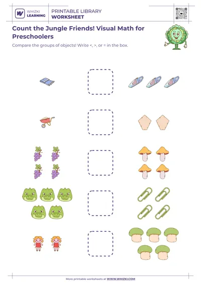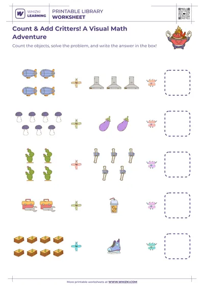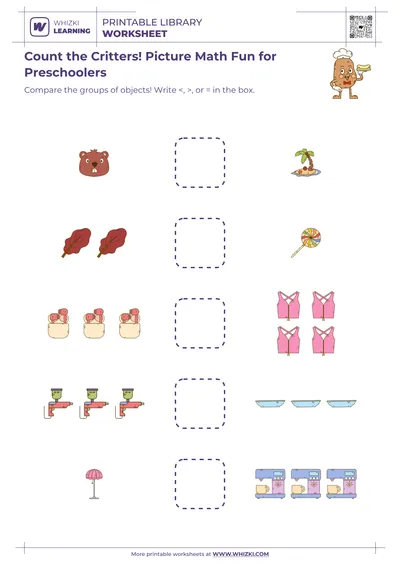 Whizki Learning printable picture math worksheet works equally well for home practice, tutoring sessions, or small-group intervention in classrooms that support older beginning learners. Caregivers can print multiple copies so the child repeats favorite pages, color pictures, or use physical counters on top of the printed objects. The flexible format allows teachers to differentiate instruction easily, using the same visual scenes for counting, comparing, and verbal explanation activities.