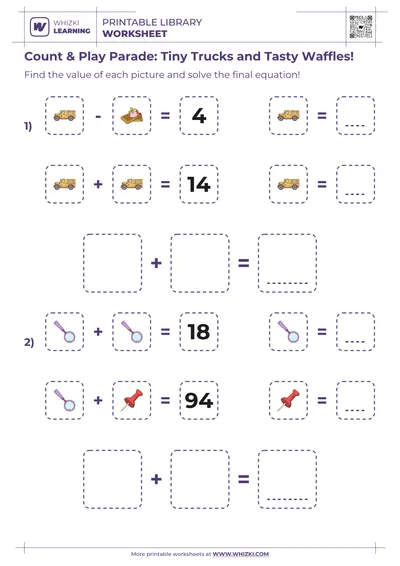 The Whizki Learning worksheet introduces early algebra-style picture puzzles in a developmentally appropriate way for preschool and kindergarten children. Each puzzle block uses familiar objects with hidden values, guiding the child to compare groups, look for differences, and understand that the same picture always represents the same number. Educator-created visual cues and clear spacing help the child focus on one idea at a time, reducing frustration and building logical thinking step by step.