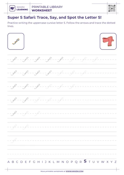 The Whizki Learning Q Letter Tracing worksheet strengthens early handwriting skills through guided motion. Large, directional strokes help the child practice hand-eye coordination while tracing the curved and slanted lines that form the uppercase Q. Literacy specialists structured every line to encourage correct pencil grip, smooth movement, and muscle memory, preparing the child for later independent writing tasks.