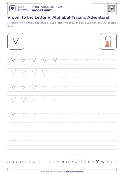 This Whizki Learning worksheet also supports fine motor development important for future writing success. Progressive line sizes, from big R paths to smaller, more precise traces, gently challenge the child’s hand strength, pencil control, and hand-eye coordination. Educator-tested layout and stroke order cues ensure that every practice line helps the child build efficient habits for forming letters, not just copying shapes.