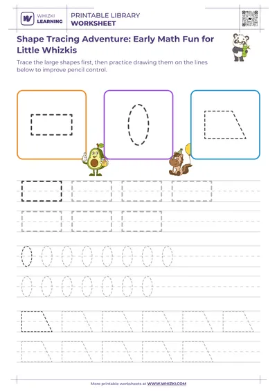 The Whizki Learning shape-tracing worksheet strengthens geometric shape recognition accuracy to 90% or higher by guiding children through repeated, high-interest tracing practice.