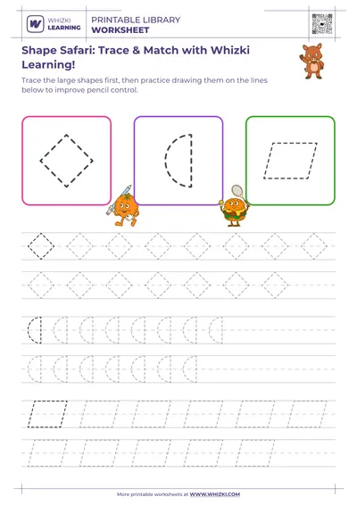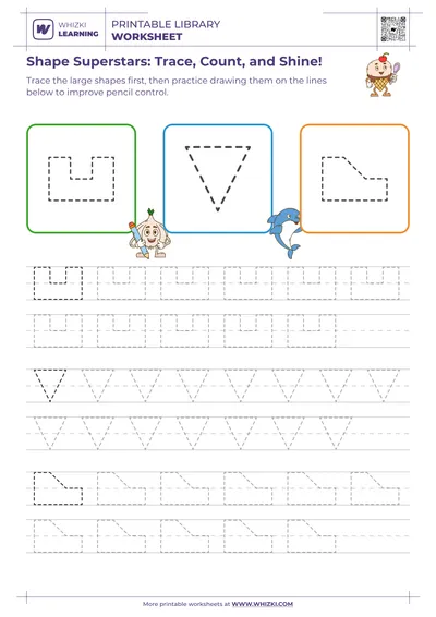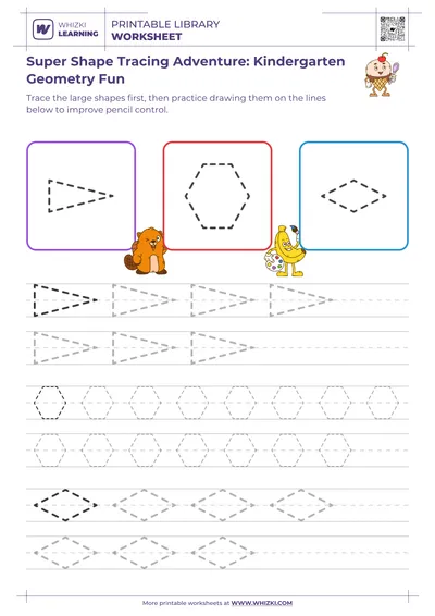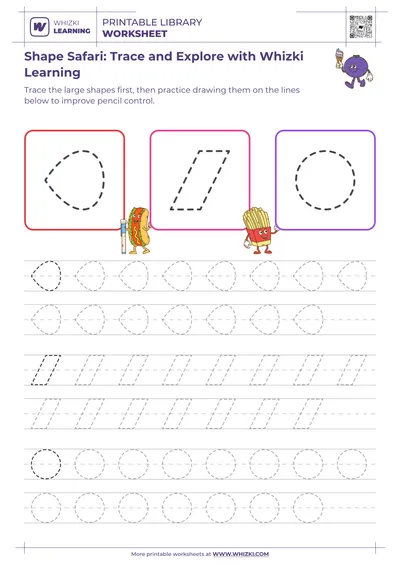 This Whizki Learning geometric shape tracing worksheet for first graders builds confident shape recognition while strengthening fine-motor control for early math success. The worksheet invites the child to trace clear outlines of circles, triangles, squares, and other beginner-friendly shapes, connecting visual recognition of shapes with purposeful pencil movement. Educator-designed paths guide the child to stay on the lines, encouraging hand-eye coordination and concentration that directly support classroom writing and math tasks.