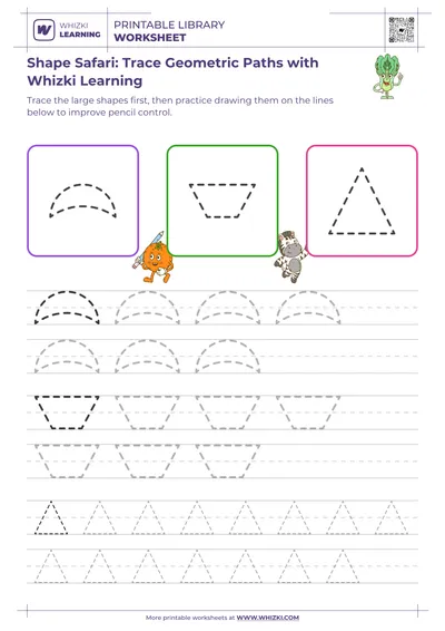Whizki Learning offers a playful geometric shape tracing adventure for preschool learners. The Whizki Learning shape tracing worksheet invites 5-year-old children to trace circles, triangles, and other bold shapes, turning early math exploration into a hands-on game. Young learners strengthen foundational shape recognition while following clear paths that guide small hands through complete geometric outlines.
