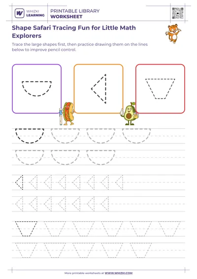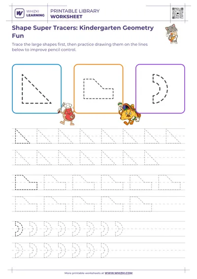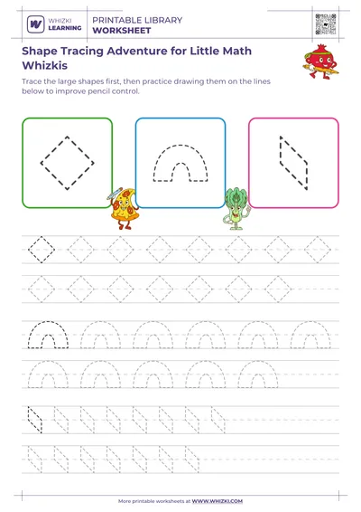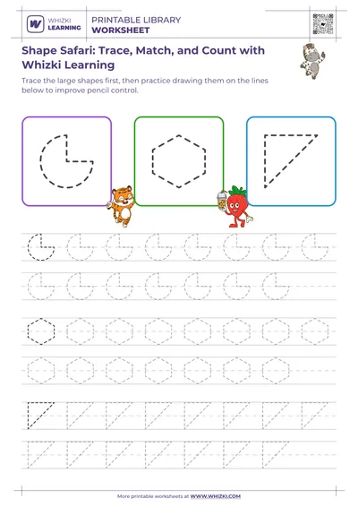 The Whizki Learning worksheet delivers classroom-quality practice at home or school, reflecting expertise from certified early-childhood educators and math specialists. Clear, uncluttered layouts and kid-friendly shapes keep focus on core skills rather than distraction. Parents, tutors, and teachers can use the Whizki Learning shape tracing resource to support children who need extra practice with early math skills, visual-motor integration, or pencil control, ensuring measurable progress through repeated, enjoyable tracing sessions.