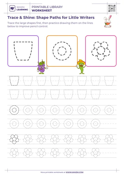 This Whizki Learning tracing worksheet for preschool and early kindergarten children uses playful shapes and simple objects to build strong pre-writing foundations. The child practices following clear paths with a pencil, which trains the small muscles in the hand and fingers for future handwriting. Educator-designed tracing lines gently increase in complexity, so the child experiences success while still feeling positively challenged.