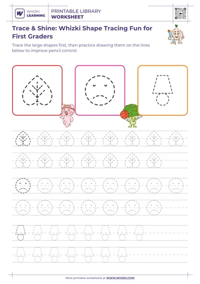 This Whizki Learning worksheet invites first grade children to trace engaging shapes and objects that build early pencil control and confidence. By following smooth, guided paths, the child practices steady hand movements that prepare young writers for clear letters, neat words, and more comfortable writing sessions.