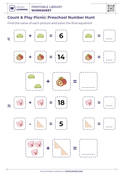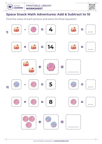 The Whizki Learning worksheet strengthens early addition within 10 by guiding the child through picture-based equations that require counting, combining, and checking answers for accuracy.