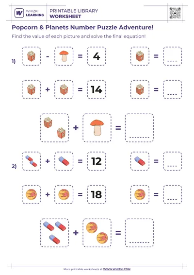 The Whizki Learning kindergarten math worksheet was designed by experienced early-childhood teachers to strengthen number sense, simple addition, and simple subtraction within ten through clearly structured picture equations.