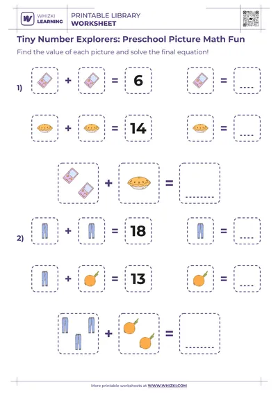 The Whizki Learning kindergarten worksheet strengthens number sense by guiding the child to match snack pictures with numerals and solve visual equations independently.