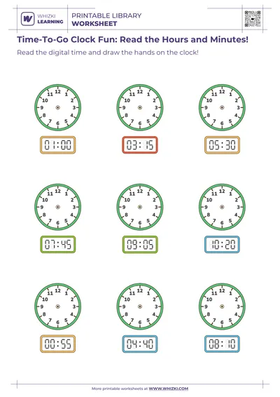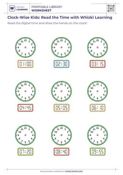 The Whizki Learning time worksheet guides the child to look at a digital time and then represent that time on an analog clock face. Each practice clock encourages the child to think about where the hour hand and minute hand belong, strengthening visual-spatial reasoning. The Whizki Learning activity can be used with pencils, crayons, or markers so the child can draw, color, and decorate each clock, turning math practice into a creative project.