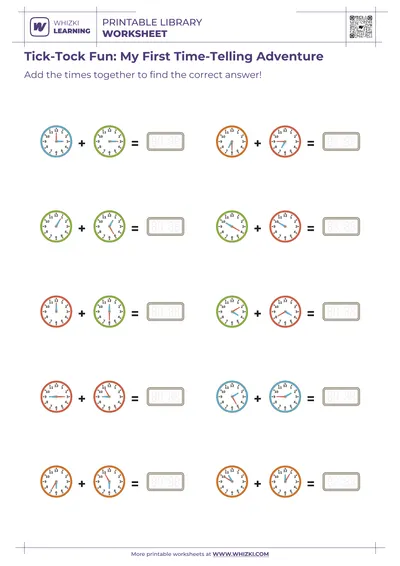 The Whizki Learning telling time worksheet for preschool and early elementary learners introduces young children to reading clocks in a playful, confidence-building way. The Whizki Learning resource focuses on matching digital times to analog clocks, giving 6-year-old children a clear visual bridge between numbers on a screen and hands on a clock. Certified early childhood educators designed the Whizki Learning worksheet to support foundational math understanding before children encounter more formal time lessons in school.