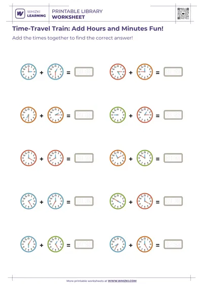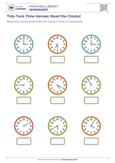 The Whizki Learning printable worksheet builds early numeracy by connecting skip-counting by fives with the minute marks on the clock. As the child works through multiple digital-to-analog time matches, the child gradually memorizes key benchmark times such as o’clock, half-past, quarter-past, and quarter-to. Repeated exposure on the Whizki Learning page helps the child develop automatic recognition of common times, supporting future problem-solving in daily routines and classroom math stories.