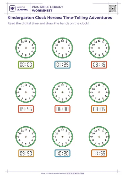 The Whizki Learning time worksheet for preschoolers focuses on recognizing whole hours and simple minute positions, helping a young child notice how numbers appear on a clock and on a digital display. By matching digital times to illustrated analog clocks, a child begins to connect early counting skills with real-world time concepts such as breakfast time, playtime, and bedtime.